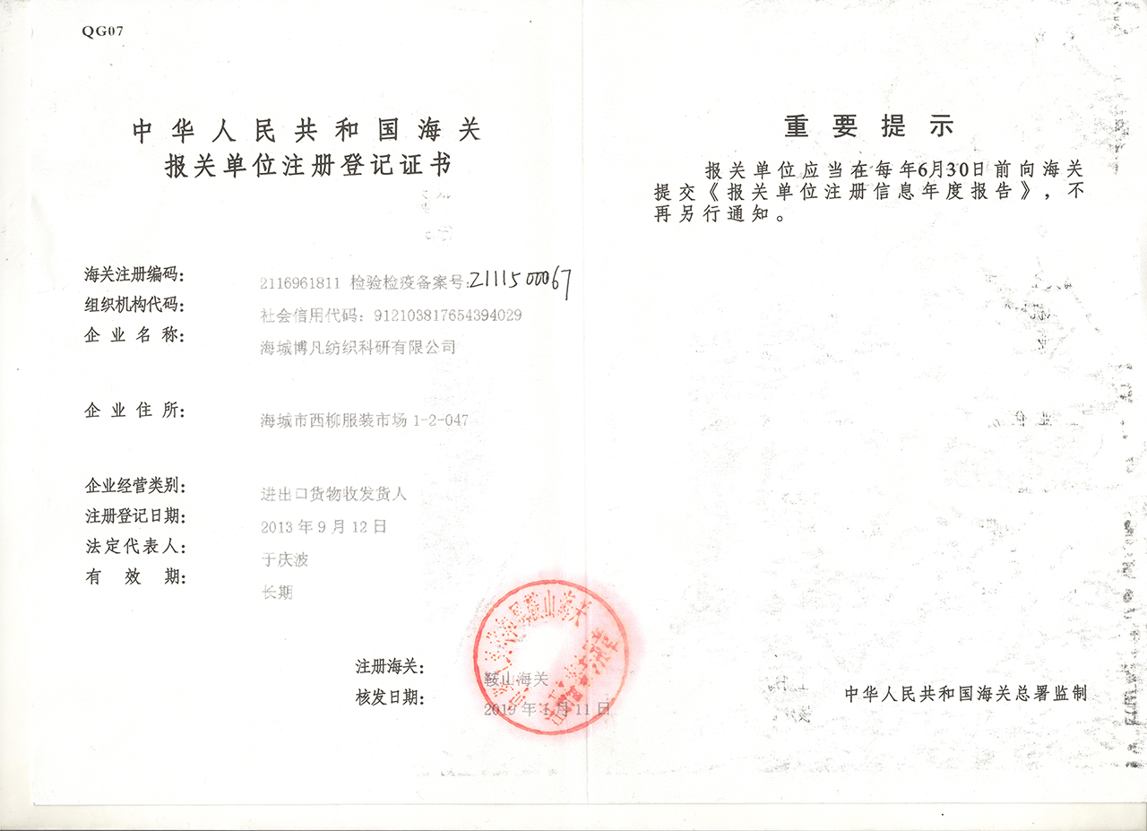 中華人民共和國(guó)海關(guān)報(bào)關(guān)單位注冊(cè)登記證書(shū) |